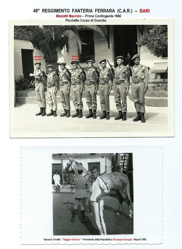 La tua richiesta : Sassara Ornello, ti ricordi di me Caporale Maggiore Mezzetti Maurizio, primo contingente 1966? - Ci siamo conosciuti a Bari, caserma Capozzi, 48° Reggimento Fanteria Ferrara (C.A.R.). Nel 1966 siamo stati aggregati alla caserma Bersaglieri di Roma e addestrati dai Vigili del Fuoco, località Capannelle Roma. Lo scopo, "Saggio Ginnico" allo stadio di Napoli, alla presenza del Presidente della Repubblica Giuseppe Saragat. Se mi leggi fatti sentire. Ciao